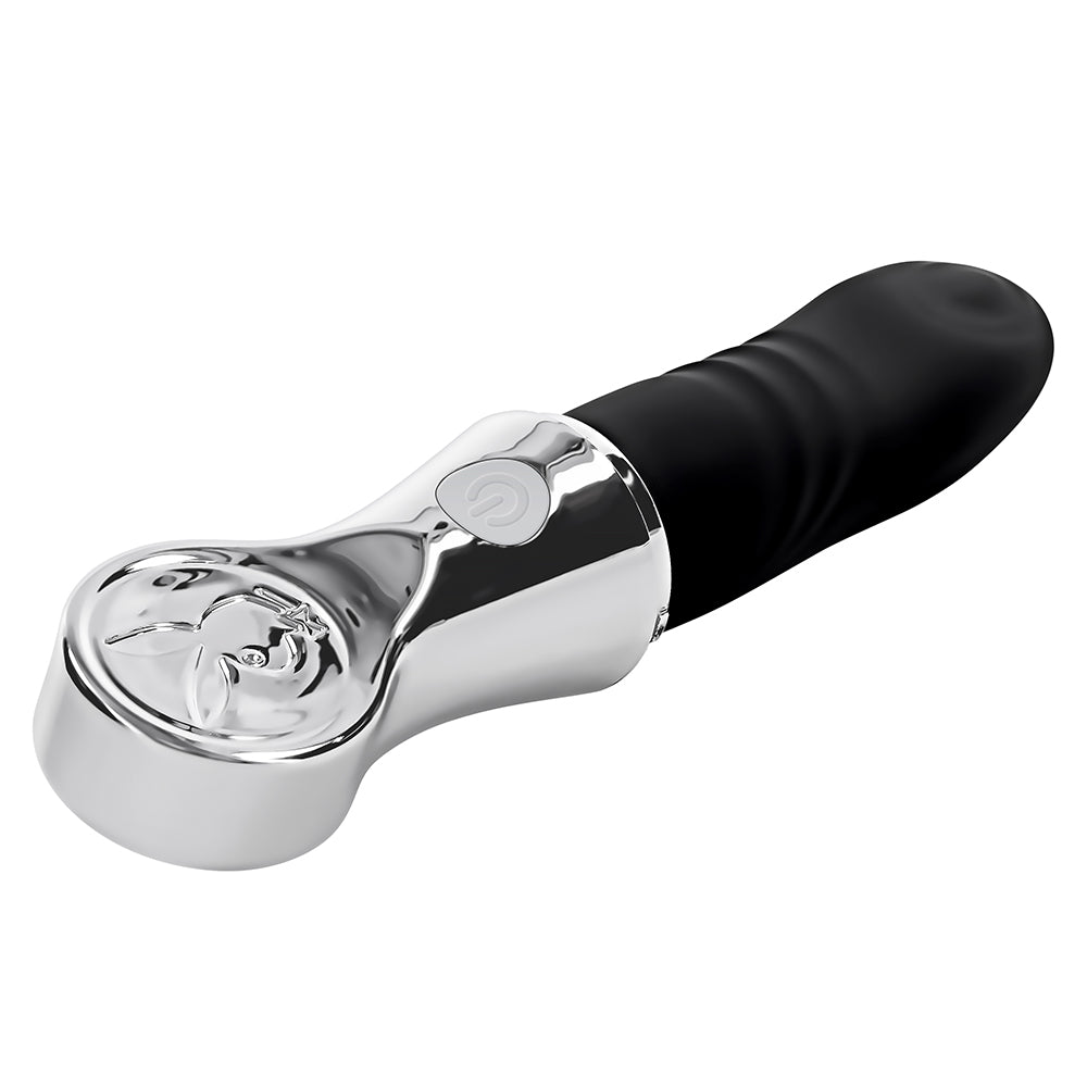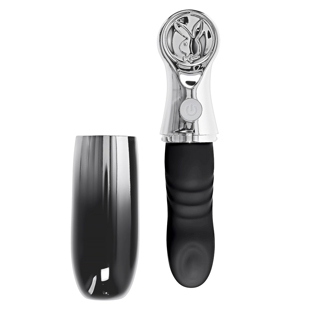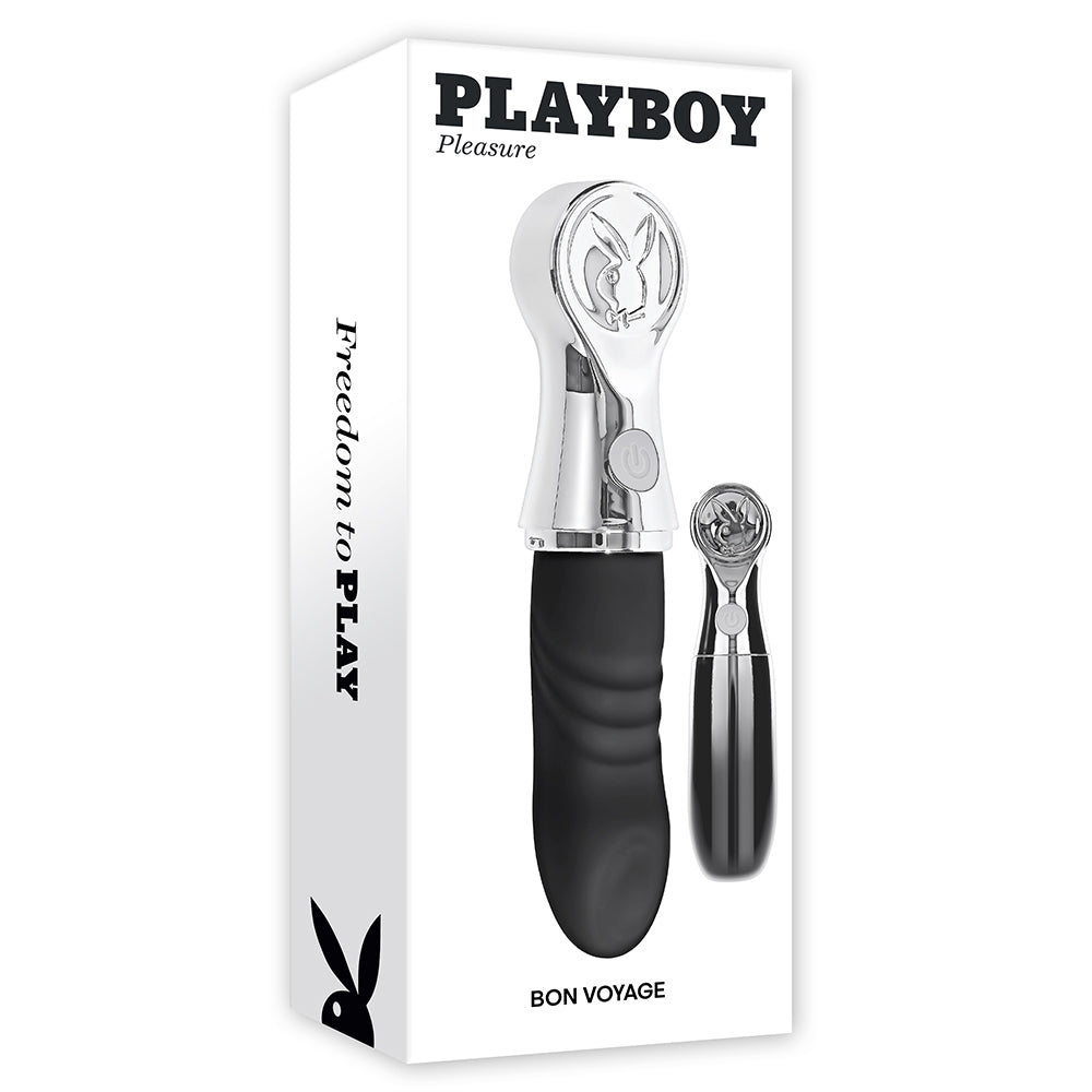 Bon Voyage! We’ve got your travel adventures covered with this powerful tapping toy you can pop into any purse, bag or carry-on luggage for pleasure on the go! The chunky shaft is ribbed for extra sensation and comes to a head with 7 speeds and rhythms of tapping in the beautifully angled tip. With its ombre chrome carrier that twists into place right underneath the ergonomic Playboy rabbit head, your toy is fully protected until you pull it out for play time whenever you like. Heading to the hot tub? Bon Voyage can join your water games as it’s completely submersible! Features: ,/p> Powerful tapping at head, Rabbit head travel case 7 Tapping speeds & rhythms Body-safe Phthalate & Latex free Silicone IPX-7 Waterproof & Submersible Five year warranty Rechargeable, USB-C cable included Height: 7.37", Depth: 1.77", Width: 1.77" Insertable Length: 3.75", Diameter 1.26"