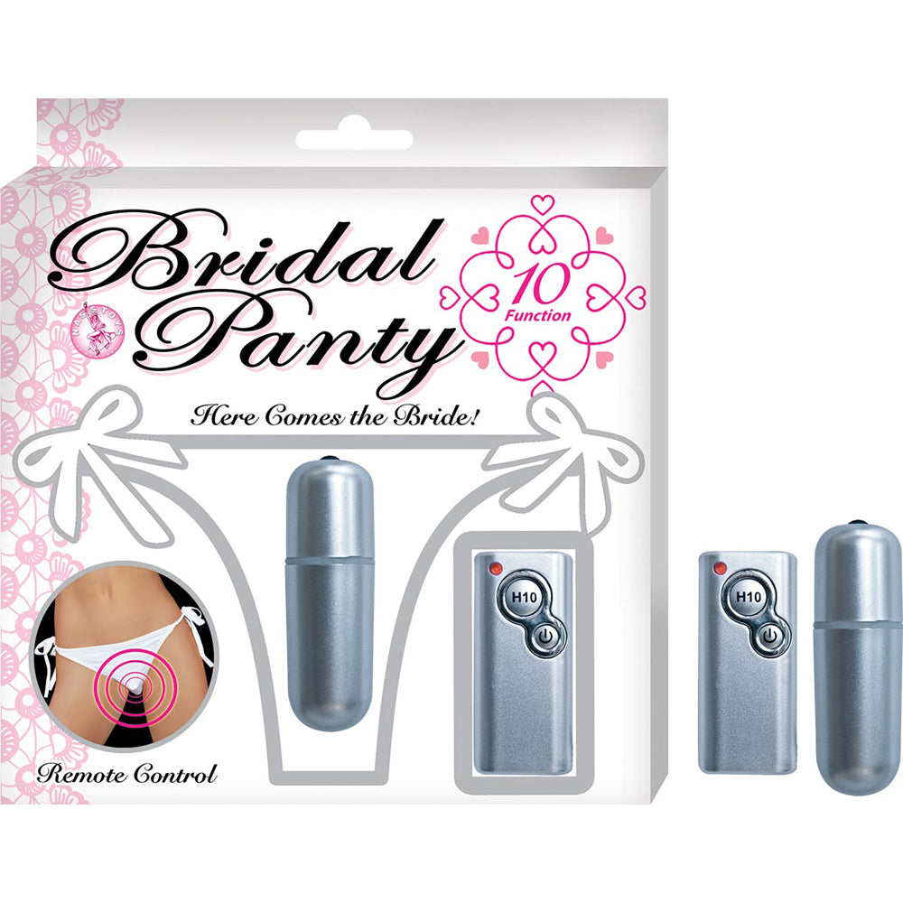 10 function Slip vibrating bullet into hidden pocket inside panty Remote control Waterproof Phthalates free RoHS compliant Materials: Panty – 95% cotton, 5% lycra, Bullet & Remote – ABS Bullet length – 2.5" Bullet diameter – 2.625" Batteries included: Remote...