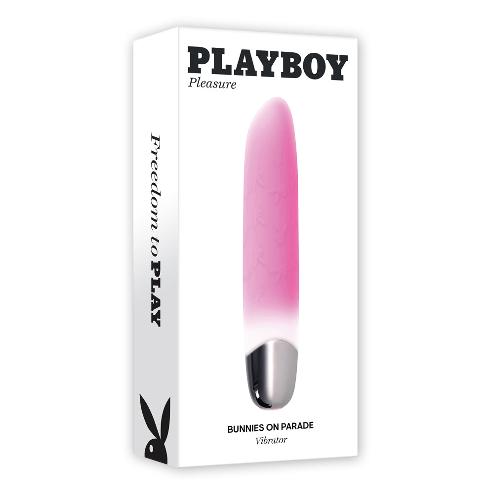 Celebrate your pleasure in style with Bunnies on Parade! This friendly Bullet Vibrator is made from specially engineered dual-layer material for a squishy-soft feel that’s deliciously life-like. The girthy shaft is longer than most bullets and ends in an angled lipstick-shaped tip to target its intense 7-speed vibrations. The purple and white gradient on the body of the bullet vibrator is adorned with a playful cavalcade of Playboy rabbit heads to remind you that your playtime is a pageant of pleasure just for you! Features: Squishy Vibrating Bullet Vibration & Tapping: 7 speeds & rhythms Body-safe silicone & ABS, phthalate & latex free Waterproof & Submersible Five year warranty Magnetic Rechargeable USB cable included Height: 6.39", Depth: 1.22", Width: 1.22" Insertable length: 5", insertable diameter: 1.22"