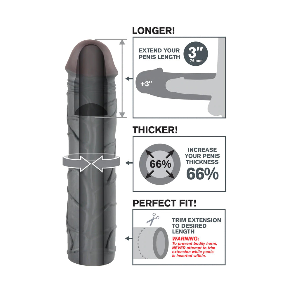 Premium fantasy x-tensions mega 3 extension black — a 3 piece fantasy x-tensions mega 3 extension black set designed to add length and girth with a lifelike feel. This kit arrives in a deep black extension color and uses a soft, flexible material for a natural look and comfortable wear. The mega 3 extension can be trimmed at the base for a perfect fit, and the set is designed to fit most sizes for easy wear. Not a hair extension—though the deep black extension color shares the sleek vibe of long black hair extensions—this is a dedicated male enhancement. The 3 piece extension set includes a realistically textured shaft and tip, delivering added length and girth with a snug, secure fit. Cleanup is a snap with the included toy cleaner, and the phthalate-free material supports safe use. Includes FREE Moist Body Lotion and Toy Cleaner. |
