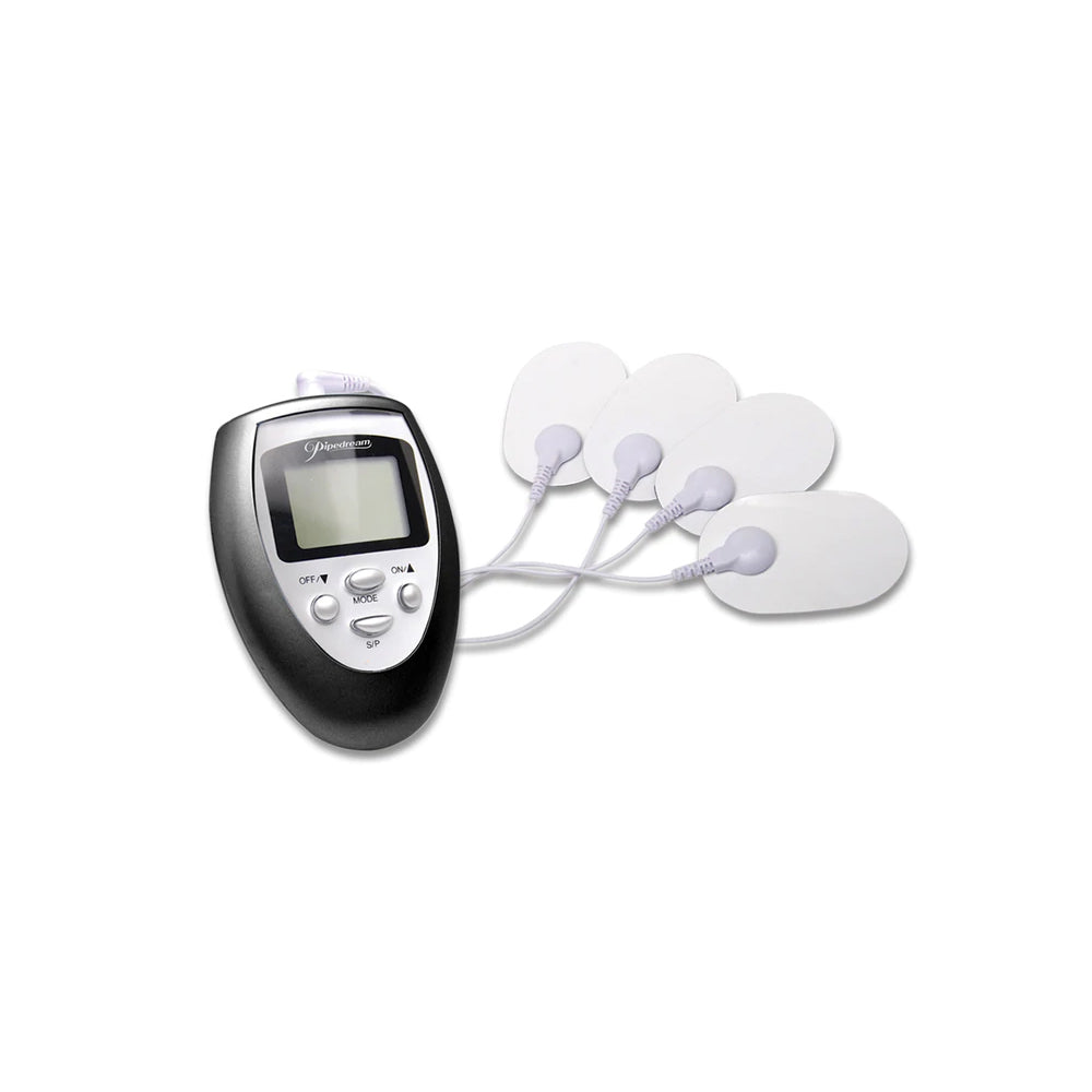Give your sex life a "charge" with this incredible beginner's electro-sex kit. This electric stimulation Shock Therapy kit is perfect for first-timers and those new to e-stimulation. The easy-to-read LCD screen on the digital power control unit clearly displays the function and intensity level, and with 3 pre-programmed pulsation patterns to choose from, this attractive control unit sends electric impulses to whichever body part you place pad on. Choose from a sensuous tingle to a throbbing tap, all with the push of a button, and pick one of the 5 body zones to stimulate. With over 100 stimulation combinations to choose from, the possibilities are endless. With the built-in timer function, the battery-powered unit will automatically shut off after the 15 minute interval. The pads are self-adhesive, attach to the lead wire using snaps, and clean up easily after the fun with Pipedream Toy Cleaner and warm water. To increase conductivity and prevent irritation, be sure to use our Fetish Fantasy Series Shock Therapy Electro Sex Gel (PD3723-06) with your Shock Therapy purchase, available in a 4 oz. tube. Great for muscle stimulation, neural stimulation, and an all-over relaxing electro massage! Includes: Digital Power Control Unit 4 Adhesive Pads Bi-Polar Lead Wire Instruction Manual Free Satin Love Mask Requires 2 "AAA" Batteries (Not Included)