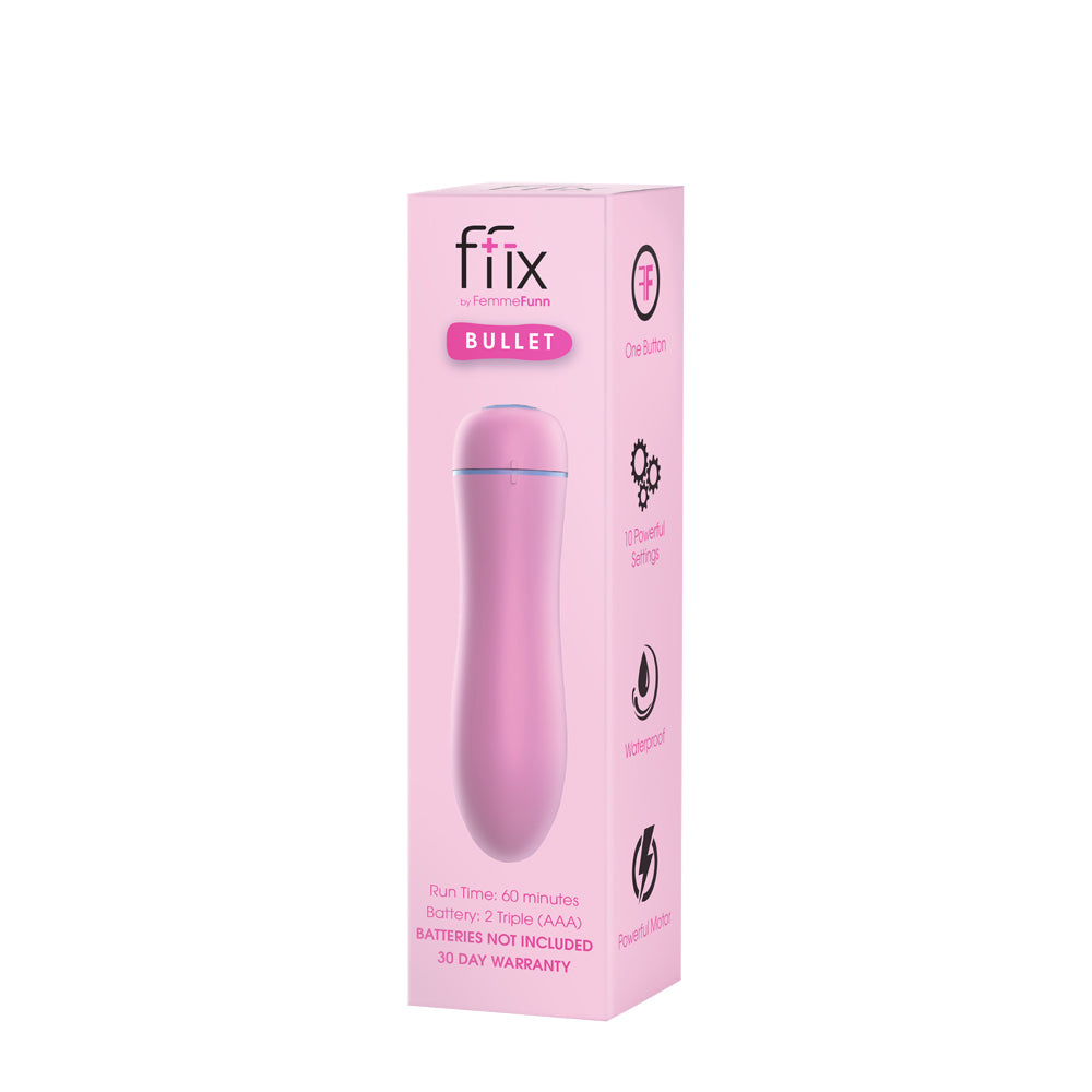 Ffix by Femme Funn. Powerful battery operated toys for quick & easy pleasure. Grab and go. The ffix Bullet packs power comparable to the rechargeable Ultra Bullet. Your New Fix. One Button 10 Powerful Vibration Modes Battery Operated (2x AAA) Waterproof