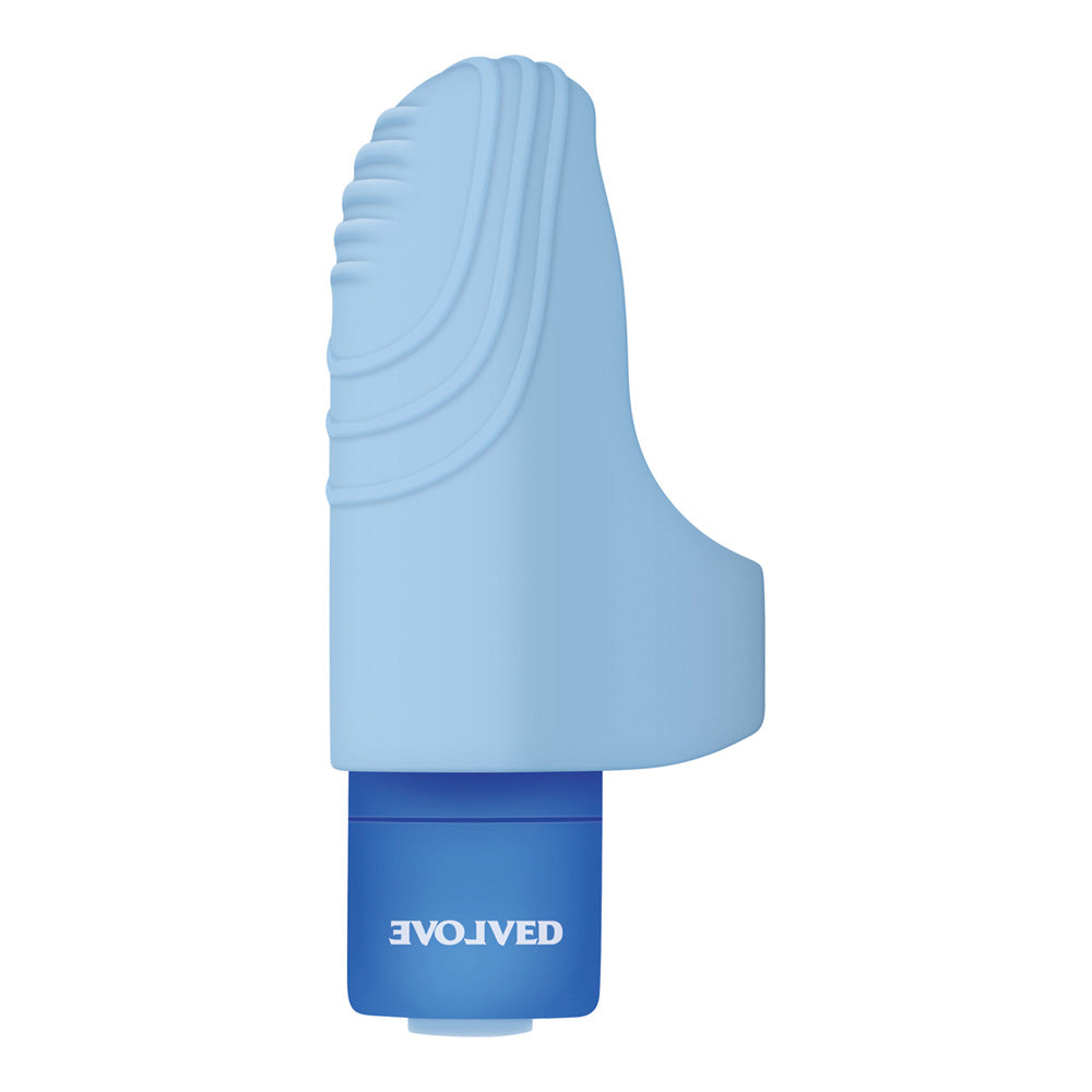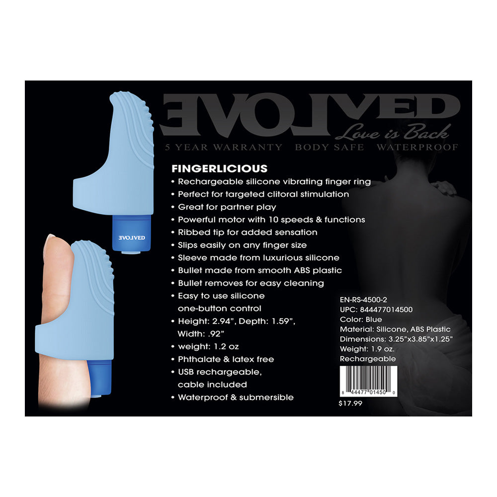 Who needs a big toy when an effortless finger ring can instantly send you on a delicious pleasure ride? Feel the magic as you or your partner slip this vibrating ring over any finger and let it explore your primary erogenous zone! The concentrated power in 10 different speeds sends scrumptious thrills through your body that are truly fingerlicious. Enjoy underwater play as it is completely submersible, and clean with Evolve Toy Cleaner and a warm water rinse. Rechargeable silicone vibrating finger ring. Perfect for targeted clitoral stimulation. Great for partner play Powerful motor with 10 speeds and functions Ribbed tip for added sensation. Slips easily on any finger size. Sleeve made from luxurious silicone Bullet made from smooth ABS plastic. Bullet removes for easy cleaning Easy to use silicone one button control.