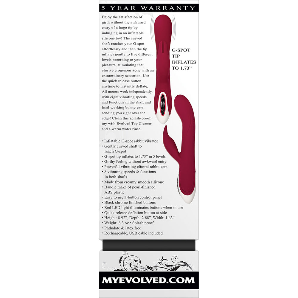 Enjoy the satisfaction of girth without the awkward entry of a large tip by indulging in an inflatable silicone toy! The curved shaft reaches your G-spot effortlessly and then the tip inflates gently to five different levels according to your pleasure, stimulating that elusive erogenous zone with an extraordinary sensation. Use the quick release button anytime to instantly deflate. All motors work independently, with eight vibrating speeds and functions in the shaft and hard-working bunny ears, sending you right over the edge! Clean this splash-proof toy with Evolved Toy Cleaner and a warm water rinse. Inflatable G-spot rabbit vibrator Gently curved shaft to reach G-spot G-spot tip inflates to 1.73” in 5 levels Girthy feeling without awkward entry Powerful vibrating clitoral rabbit ears 8 vibrating speeds & functions in both shafts Made from creamy smooth silicone Handle make of pearl-finished ABS plastic Easy to use 3-button control panel Black chrome finished buttons Red LED light illuminates buttons when in use Quick release deflation button at side Splash proof Phthalate & latex free Rechargeable, USB cable included