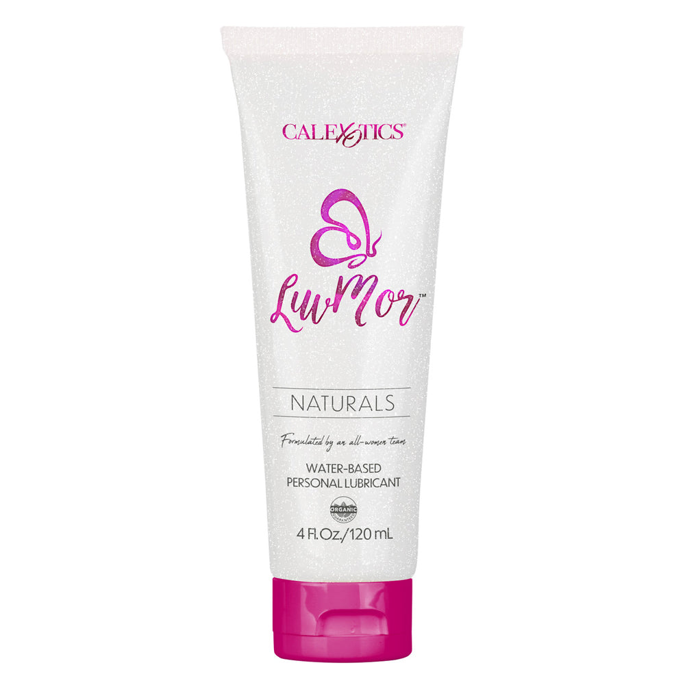 Show yourself a little more luv with the playful LuvMor™ Naturals Water Based Personal Lubricant. The premium water-based formula is sure to enhance natural lubrication with hyaluronic acid. Keep playtime going as long as you can with the super-slick formulation for a naturally moisturizing and long-lasting effect. Expertly created by the sexual health experts at CalExotics, the water-based formula is hypoallergenic, pH-friendly, safe for all skin types, and free from artificial fragrances and colorants. Blended in the USA. How to Use: Use as needed to enhance intimacy and pleasure. Apply a small amount of water-based lube to desired area to lubricate, reapply as needed. Easily washes away with warm soapy water.