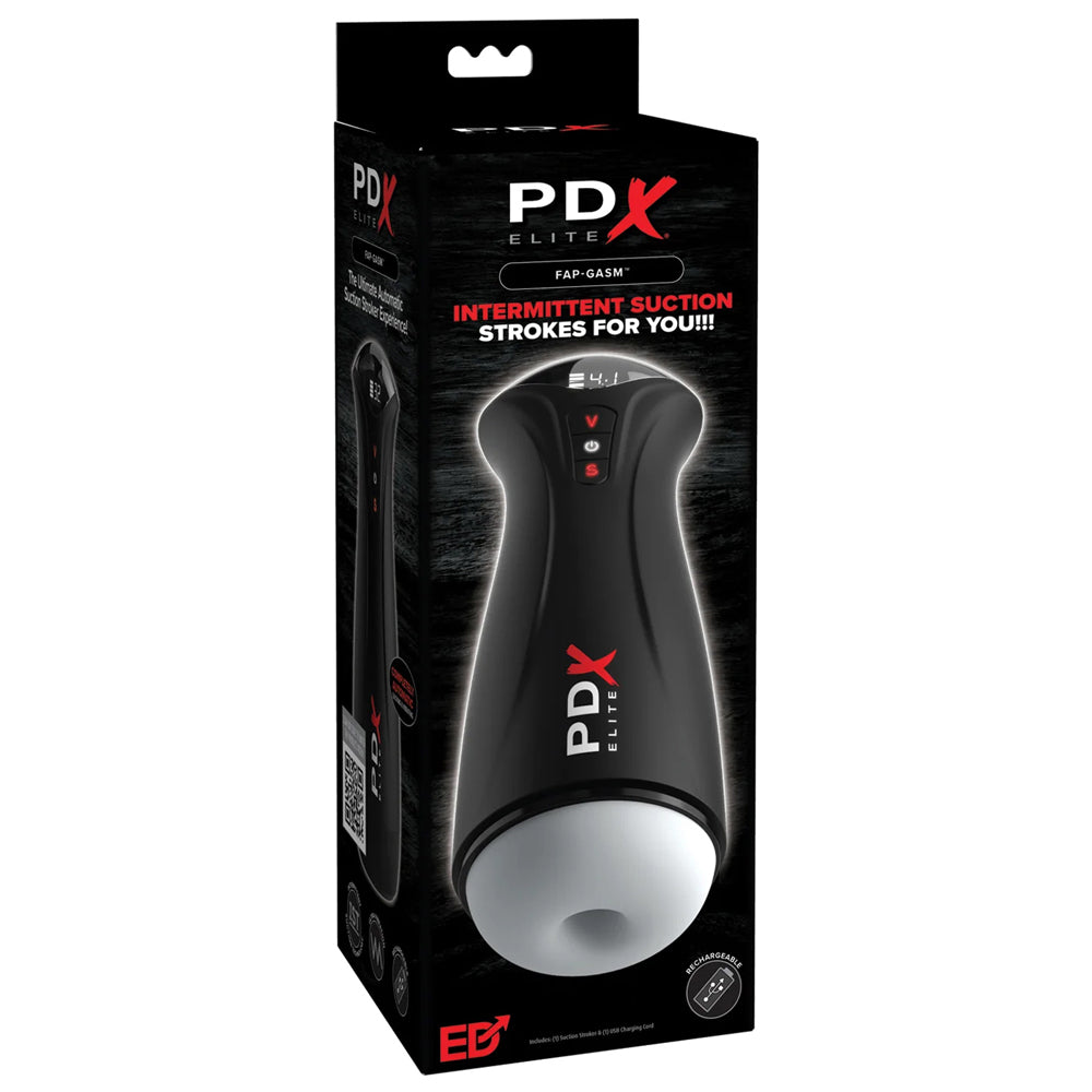 The PDX ELITE Fap-Gasm elevates masturbation with powerful intermittent suction and vibration for the ultimate stroker experience. It's a perfect storm of sensation for heightened solo sex sessions that can be customized to your personal moods! Get ready for explosive hands-free pleasure as the Intermittent Suction Technology automatically sucks your penis in and out. Designed for ultimate pleasure, the textured walls of the ultra-soft sleeve is like nothing you've ever felt before! The Fap-Gasm is ready when you are, and will deliver the most intense orgasms you've ever had!