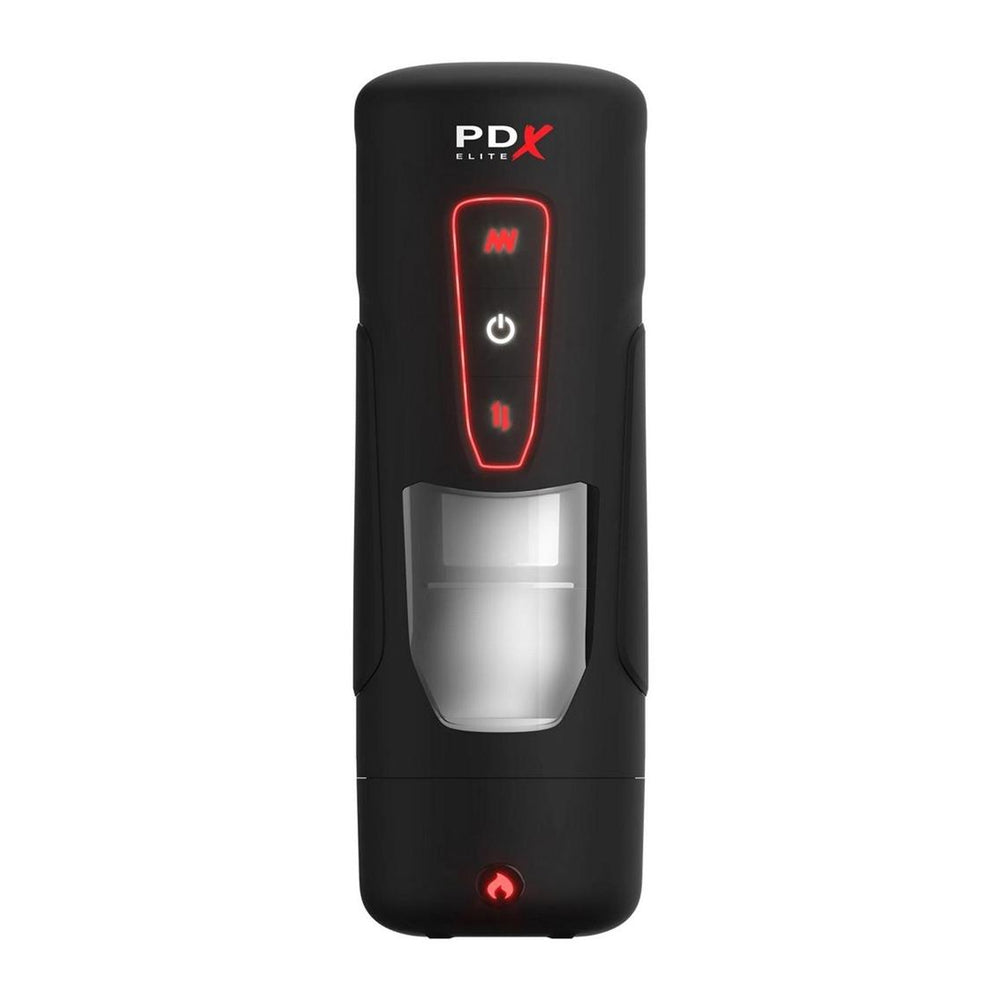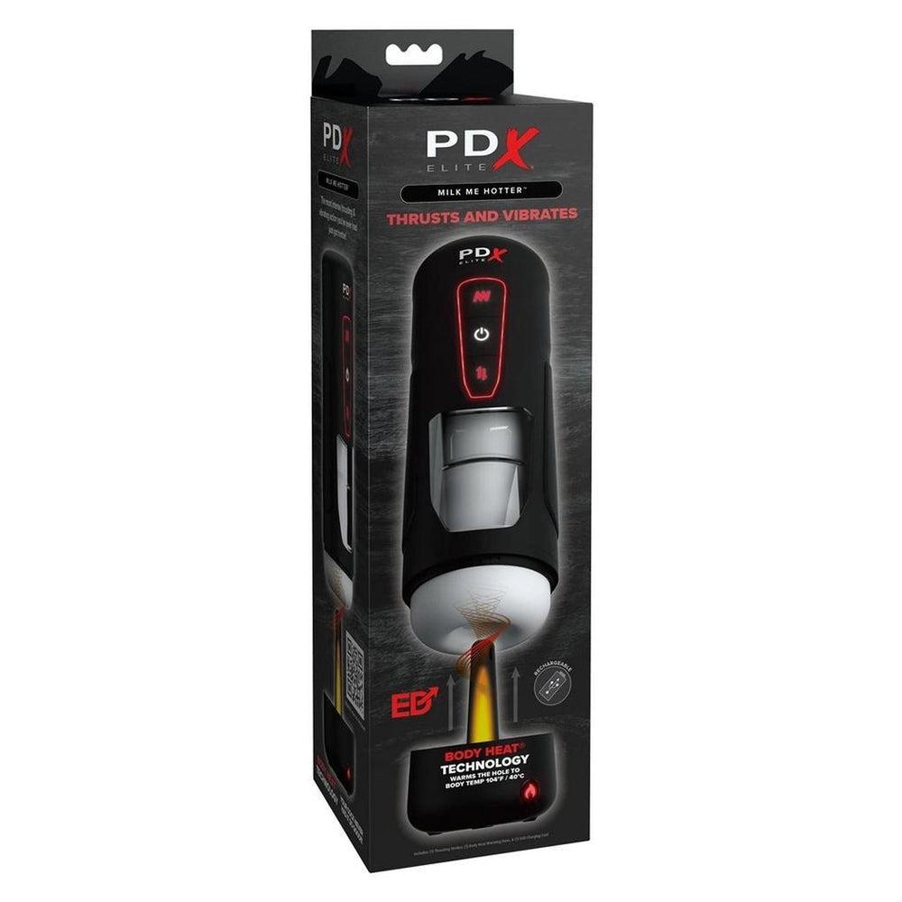 The PDX ELITE® Milk Me Hotter™ elevates masturbation with powerful intermittent thrusting for the ultimate stroker experience. It’s a perfect storm of sensation for heightened solo sex sessions that can be customized to your personal moods! Get ready for explosive hands-free thrusting, surrounding your penis with ultra-soft, automatic stroking action! Watch all the stroking through the transparent window! Your ultimate masturbation experience is ready when you are! Features: Intermittent thrusting technology: The ultra-strong motor provides 10 deep, pleasing thrusting modes. Intermittent thrusting automatically strokes your penis up and down for pleasures beyond your wildest dreams! Personalize your power: Enjoy 10 modes of vibration 10 modes of thrusting! Strategically positioned to maximize stimulation to your penis, the powerful vibrator will tease and please! Try all 10 modes of each and customize your pleasure! Ultra-Soft Sleeve: The extraordinary feel of the ultrasoft sleeve caresses your penis with every stroke from the powerful motor. The round nubbies wrap around your entire shaft, while the Milk Me Hotter automatically strokes and vibrates for mind-blowing stimulation! Body Heat® Technology! A specialized heating element warms the Milk Me Hotter’s tunnel to simulate the perfect body temperature! Feel the BODY HEAT as your shaft slides in and out with exhilarating vibration and thrusts! Reaches Body Temperature 104° in 15 minutes.