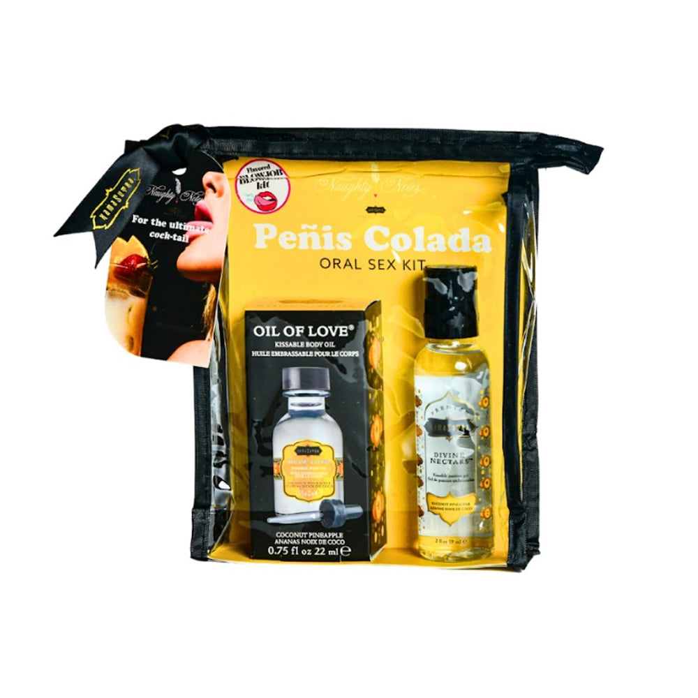 FOR DELICIOUS ORAL SEX & MORE This kit contains two juicy products that make oral sex slippery and delicious: Oil of Love flavored, warming body oil and a Divine Nectars flavored lube & body glide. The kit also includes 2 sex positions with instructions and a QR code with cocktail recipes! Everything comes in a reusable zippered bag for fun on-the-go.