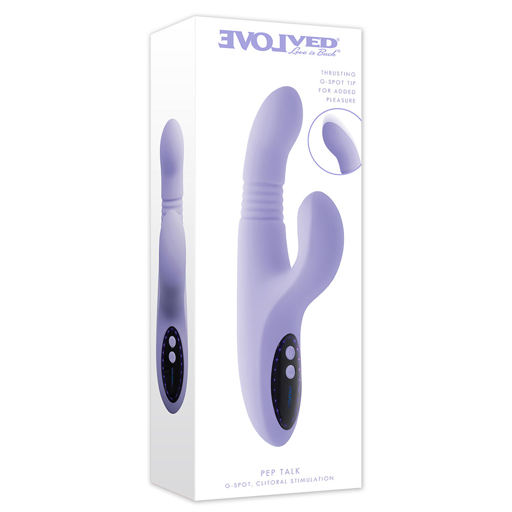 Pep Talk speaks fluent body language with its trio of powerful functions - thrusting and vibration for deep internal sensation and a flexible, tapping stimulator designed to pulse rhythmically against the clitoris. As intense pleasure builds, funky purple lights flash around the ergonomic control panel, adding a visual pop to cheer you on. Features: 10 thrusting & vibrating speeds & patterns 10 tapping speeds & patterns Insertable length 4.75", diameter 1.45" Made from phthalate & latex-free silicone Rechargeable, USB cable included Waterproof IPX-6 shower-friendly Lab tested body safe