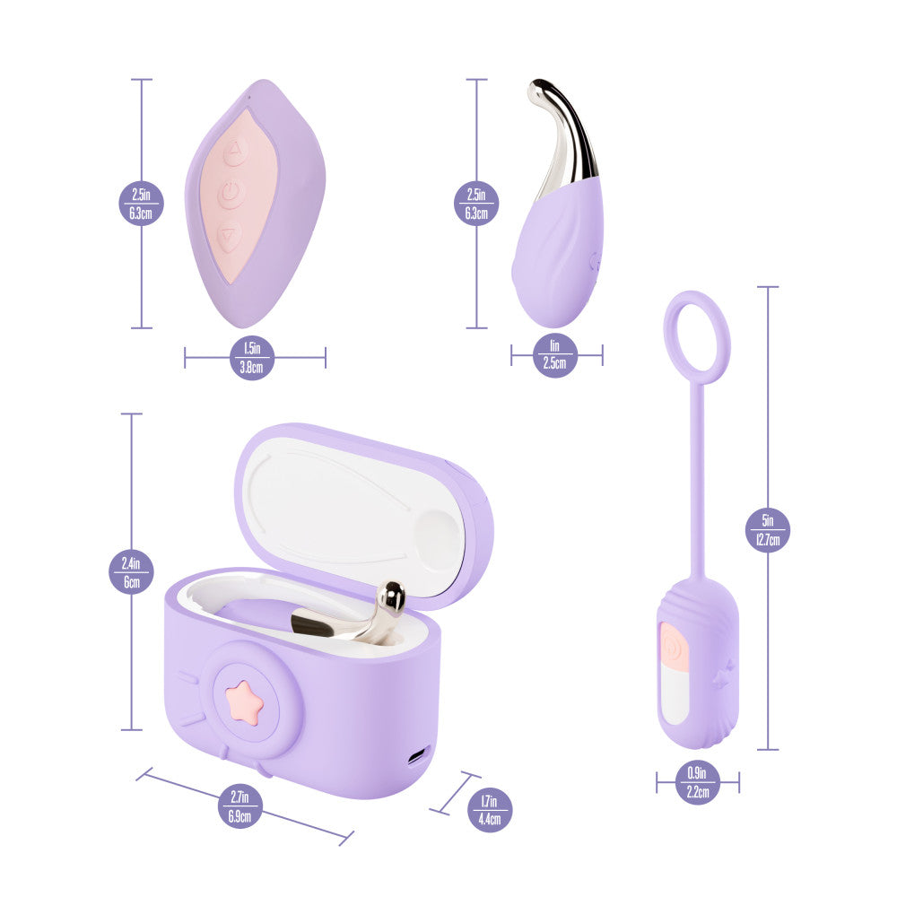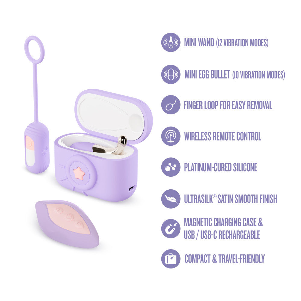 Capture your pleasure from every angle with Snapstar! This 4-piece vibrator set is your all-access pass to pleasure, featuring a discreet, camera-inspired travel case, a mini wand, a bullet vibe, and a wireless remote for hands-free play. Sleek, discreet, and travel-ready, Snapstar keeps everything organized and charged wherever desire takes you. Inside the stylish case, you’ll find two powerful mini vibes: a precision wand with 12 vibration modes that deliver targeted stimulation, and a smooth bullet with 10 thrilling patterns for playful exploration. Both are crafted from 100% body-safe silicone and finished with our UltraSilk® satin-smooth touch for a soft, luxurious feel. The silicone finger loop ensures confident control and easy removal, while USB-C recharging keeps your set ready to go at a moment’s notice. Compact, elegant, and endlessly versatile, Snapstar makes every destination and every moment iconic. Features: Featuring 2 Vibrators With A Travel Charging Case Mini Wand With 12 Pinpoint Vibration Modes Mini Egg Bullet With 10 Vibration Modes Wireless Remote For Hands Free Pleasure Finger Loop For Easy Removal & Safe Play