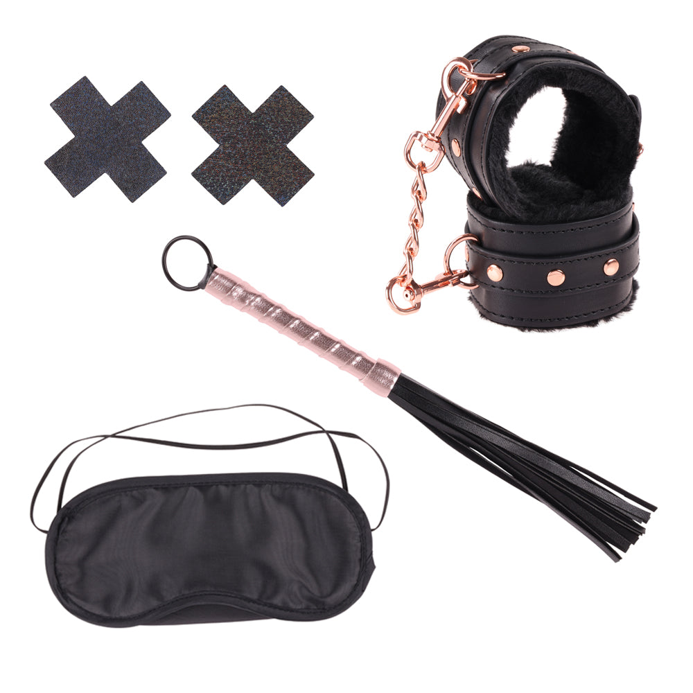 Have you been pushing all their buttons? Your punishment awaits with the Brat Kit. Let them attempt to tame their favorite brat with a kit designed to put you in your place. You’ll be at their mercy with soft-lined wrist restraints, an elastic blindfold, single-use pasties and a mini flogger. Features: Kit includes wrist restraints, single-use pasties, blindfold, and mini flogger High-quality, faux leather design for added durability Soft yet sassy with rose gold accents Faux fur lined cuffs for comfort fits wrists 6" to 9.5"