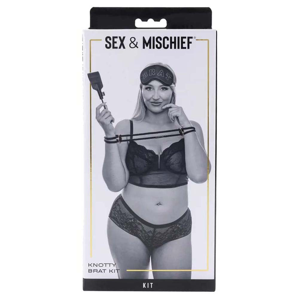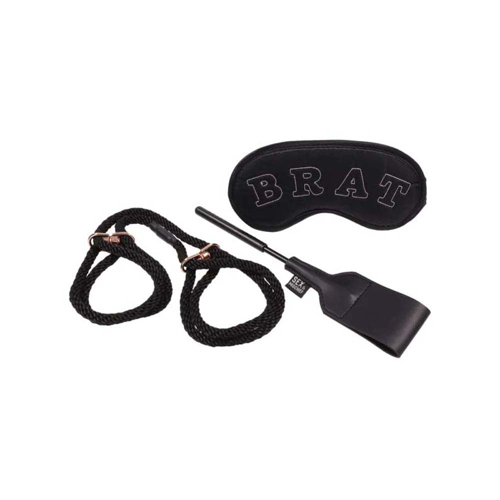 Teach your bratty bottom how to properly submit with the perfectly curated Knotty Brat Kit! Keep them restrained with the included rope handcuffs in a stunning black with rose gold metal accents while you tap and tease every inch of their body with the accompanying mini crop. Punish them by taking away their sight with the included satin blindfold emblazoned with 'BRAT', and inflict them with your every naughty desire they deserve. Features: Adjustable Tension Rope Cuffs with Two Clasps Satin Blindfold with Rose Gold Stitching Spelling 'BRAT' Mini Faux Leather Tipped Crop