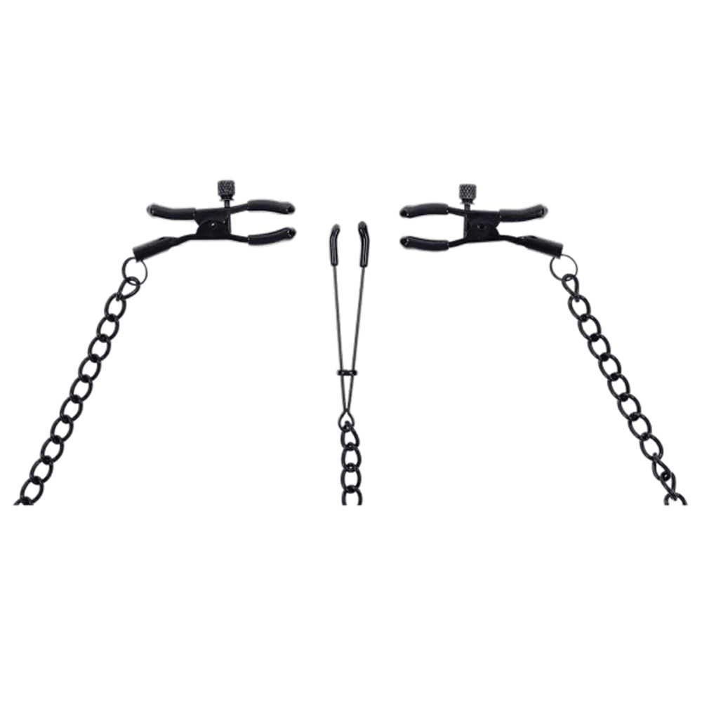 Ignite your passions and take intimacy to sensational new heights with the Saffron Nipple to Clit set. Perfectly crafted for use both in and out of the bedroom, feel the illustrious black chains drape down your body from the connected chain collar. Tease yourself with attached nipple clamps to add pressure and arousal to your most sensitive areas while a third tweezer clamp stretches down to your clit for tantalizingly seductive tension. Perfect to create heightened experiences during sensation play or as a playful reminder of your submissive place as its worn under your clothes. Secure and comfortable, the Nipple to Clit Set allows you to reign in your pleasure however you like as they tug and tease with every movement. Features: Two adjustable nipple clamps and tweezer clit clamp for precise tension Rubberized tips for comfort and reduced slippage Chain collar connects to nipple and clit clamps with center O Ring Removeable collar for discreet wearing
