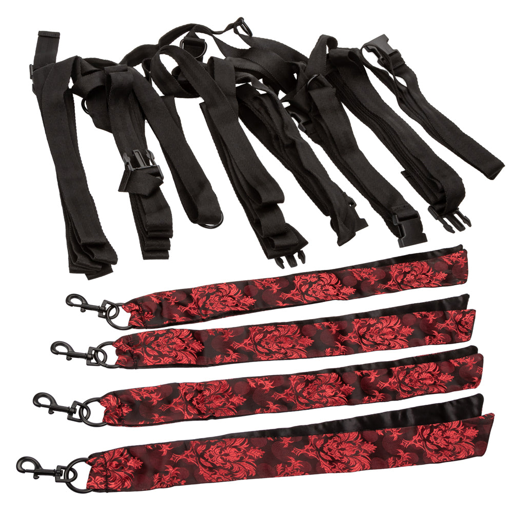 Strap in and open yourself up to sensationally enhanced pleasure with CalExotics Scandal® 8 Points of Love Bed Restraint fetish sex toys. The designer bondage sex toy restraints are ideal for seasoned sexual fetish lovers and bashful beginners alike with easy-to-use adjustable straps, versatile tethers and 8 D ring connectors for a variety of sexy bondage positions. The versatile bed restraint has 8 points of connection for both the ankles and wrists cuffs to give your dominant a full view of your sensually exposed body or quickly change your sex position. With universal swivel clasp design on each tether, your lover will be able to take full control over your pleasure and leave you trembling with desire during any bondage sex scene. This luxurious over the bed restraint lets you experiment with passionate power play and get Scandal®ous with 8 points of pleasure. Thoughtfully architected for mutual pleasure. Make more of your intimate moments. Non-tarnishing and nickel-free, this product is safe and worry free.