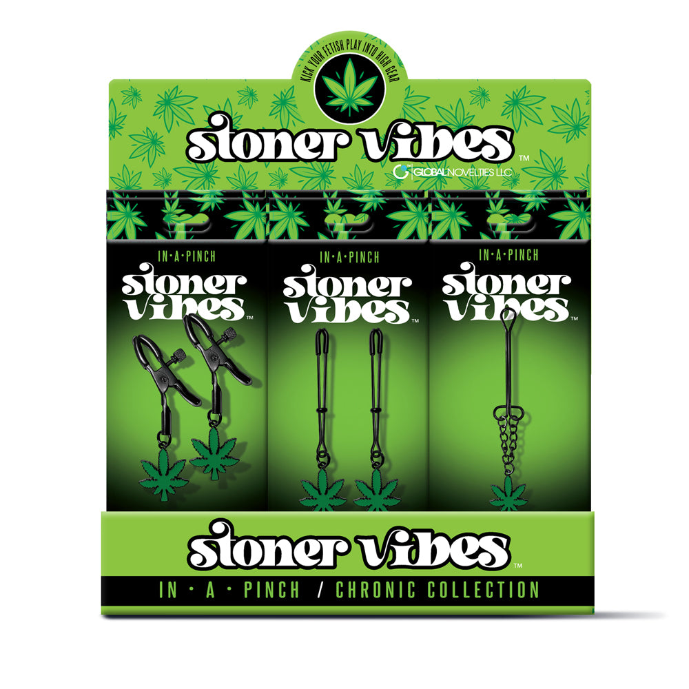 Stoner Vibes Chronic Collection In A Pinch 15Pc Display Includes: 5 Stoner Vibes Nipple Clamps that include removable rubber tips, providing a softer feel against the nipples. 5 Stoner Vibes Nipple Tweezer Clamps that uses a ring to adjust the tightness to create the perfect pinch level for you or your partner. 5 Stoner Vibes Clitoral Clamp which features a slide-to-fit design that makes adjusting the intensity trouble-free.