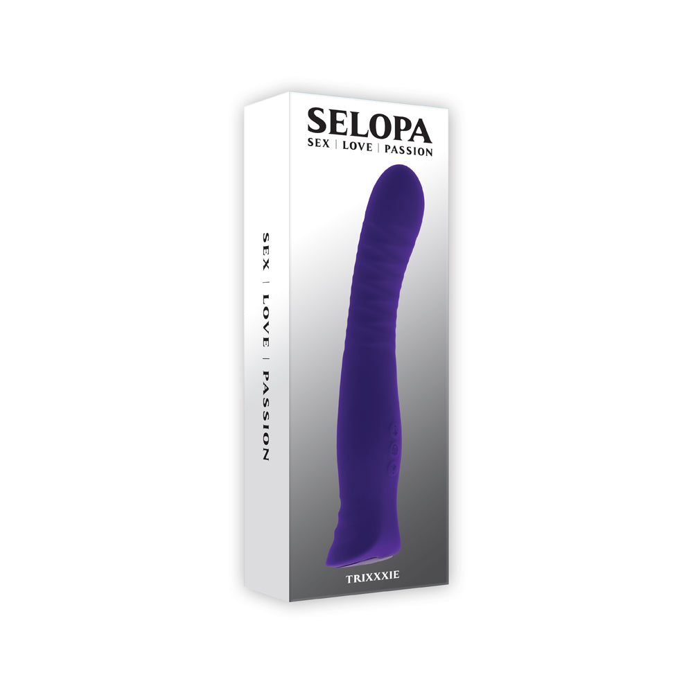 Trixxie is a beautifully designed, deeply textured vibrator with flexibility in its gently arched shaft and the unique ability to go back and forth between vibration modes without cycling. Features: 7 vibrating speeds & patterns Made from phthalate & latex-free...